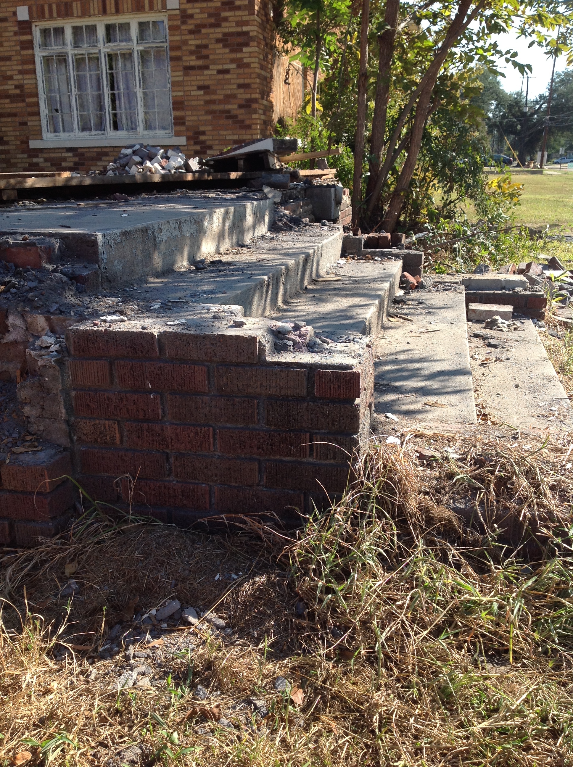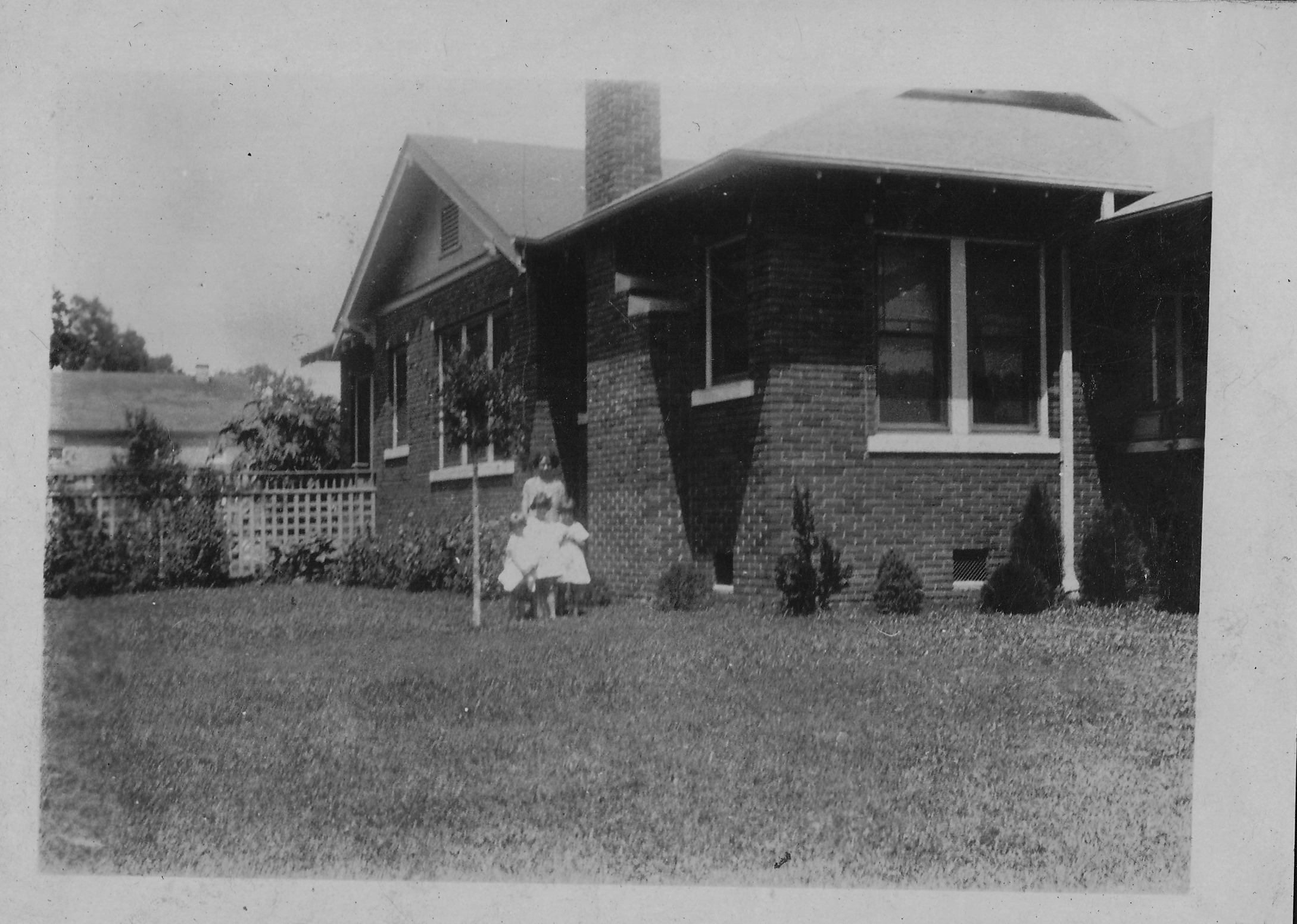 The critical detail in this photo is just to the girls’ left. That odd white structure in the brick porch wall is a concrete downspout, one of two that were inserted in the wall when it was built in 1922. Their intended purpose, I’m sure, was to carry rainwater away from the porch floor, a clever device that I’ve never seen anywhere else. But it was their unintended use, dreamed up by swimming pool-averse Jessie, that made those downspouts a must-salvage element for me as we demolished the bungalow. One of my favorite Sara stories was her recollection of sizzling summer days on Strong Avenue, when Jessie would plug up the downspouts and flood the front porch with the garden hose. The girls could splash and spray to their hearts’ content and then Jessie would pull the plugs away and let the water drain off into the flower bushes. Having lost a younger brother in a Moon Lake drowning incident in 1919, she kept her flock as far from pools and rivers as possible, and this was her one concession to children’s natural attraction to aquatic play. Sara never forgot the fun of those days, but she also never learned to swim.