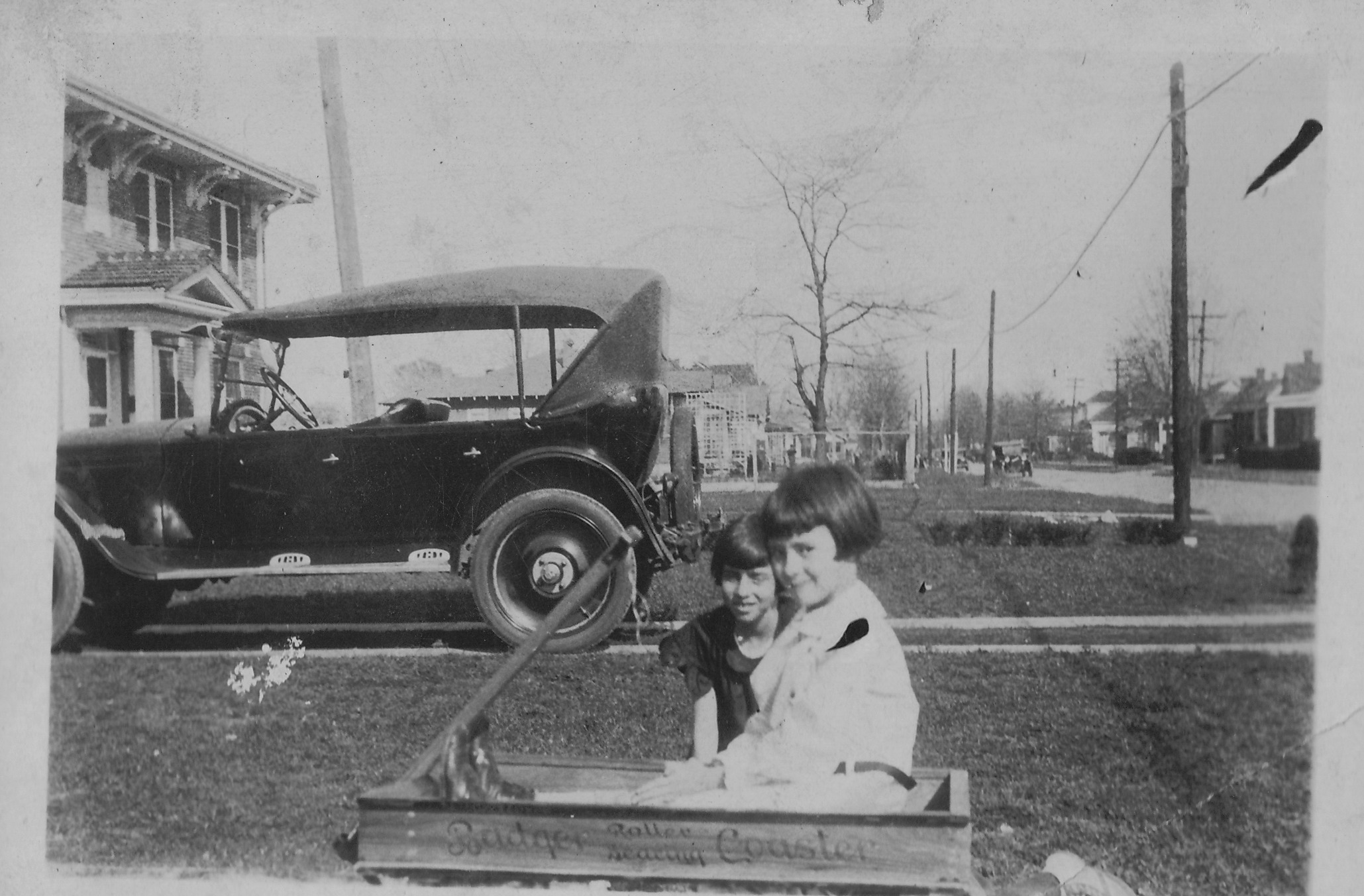 “One Sunday afternoon while Mama and Daddy were resting and reading the paper, we decided to take all of our dolls outside to play. Daddy had a long old car called a Hupmobile. At that tim all the cars had running boards which you stepped onto climb in since cars were high off the ground. We rowed all our dolls out on the running board side of the car. A little while later Daddy decided to go to the Elks Club for a little while and off he drove, dolls and all. Soon Mama got a call from Mrs. Sally Clements, who lived down the street, saying that Mr. Evans had passed her house and that when he turned the corner by the old cemetery dolls started falling off the running board and were scattered all over the street. They were rescued, but Daddy was a little embarrassed by the whole affair.”
