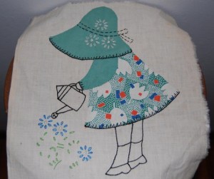 “Mama had to stay in bed for awhile after she came home, and a black woman named Ruth helped out around the house. We stayed at home a lot that summer, had a lot of tea parties, and when she was able, Mama made homemade ice cream in the afternoon. We had attended Bible School at Calvary Baptist Church, and they had let us make a quilt square, a Sunbonnet Baby in my group and an Overall Boy in Mary’s, so she and I spent a lot of time using the scraps left over from our dresses to make quilt squares. Mama showed us how to put them together, and that fall we entered them in the exhibits at the State Fair. Mine won a blue ribbon. Mary was competing in an older class so she did not win a ribbon.”