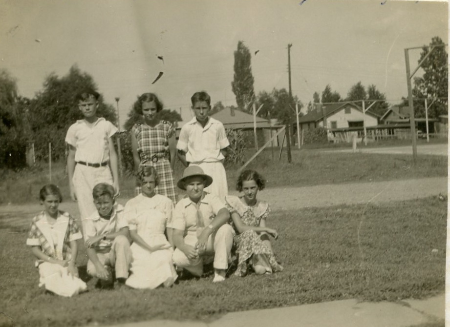 Sara's "Gang" : Front row, Elizabeth Hale, Harold Hemmer, Mary Hayes Crow, Spot Pettey, Lena White Miller; Back Row: James Millard Pierce, Sara, Billy Woodell