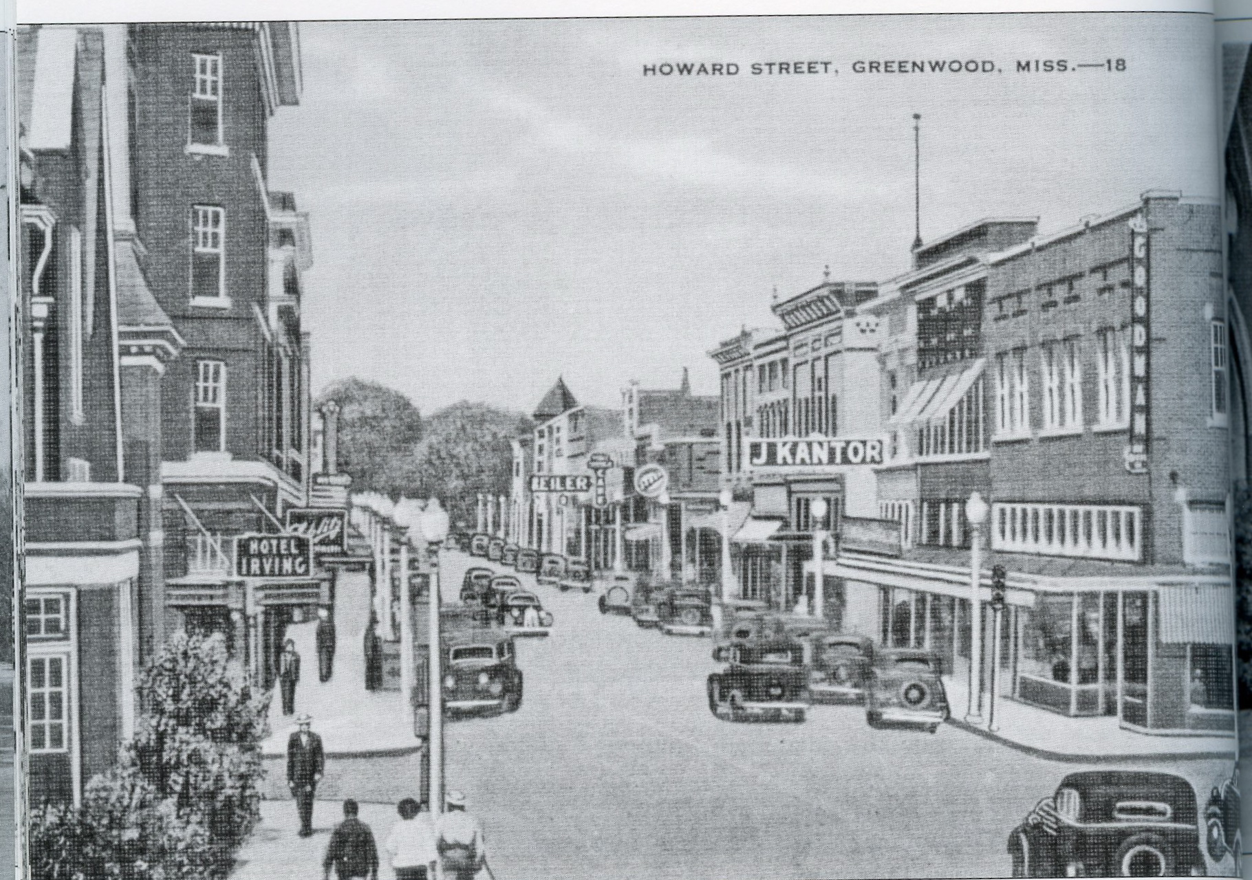 Howard Street in the 1930s. Sara would have likely been found in Woolworth's, on the right between Kantor's and Penney's. Postcard courtesy of Donny Whitehead, aboutgreenwoodms.com