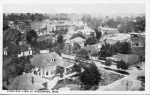 Downtown Greenwood from the Greenwood Utilities water tower; Miss Daisy's house is the large one in the foreground. Notice how many homes there are in the downtown area, circa 1930. Photo courtesy of Donny Whitehead.