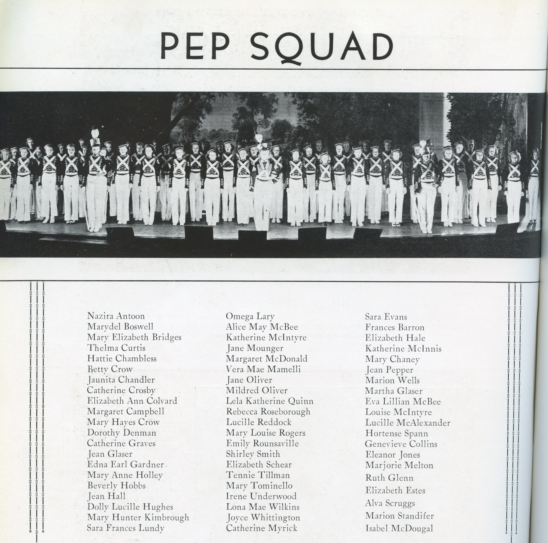 “We [Sara, Lucille McAlexander, Mack Standifer] joined the Pep Squad, a group of girls who marched with the band and cheered at the football games. Roy Martin, the band director, was noted for his big halftime shows, and we had to practice in the afternoons and at night before a football game.
