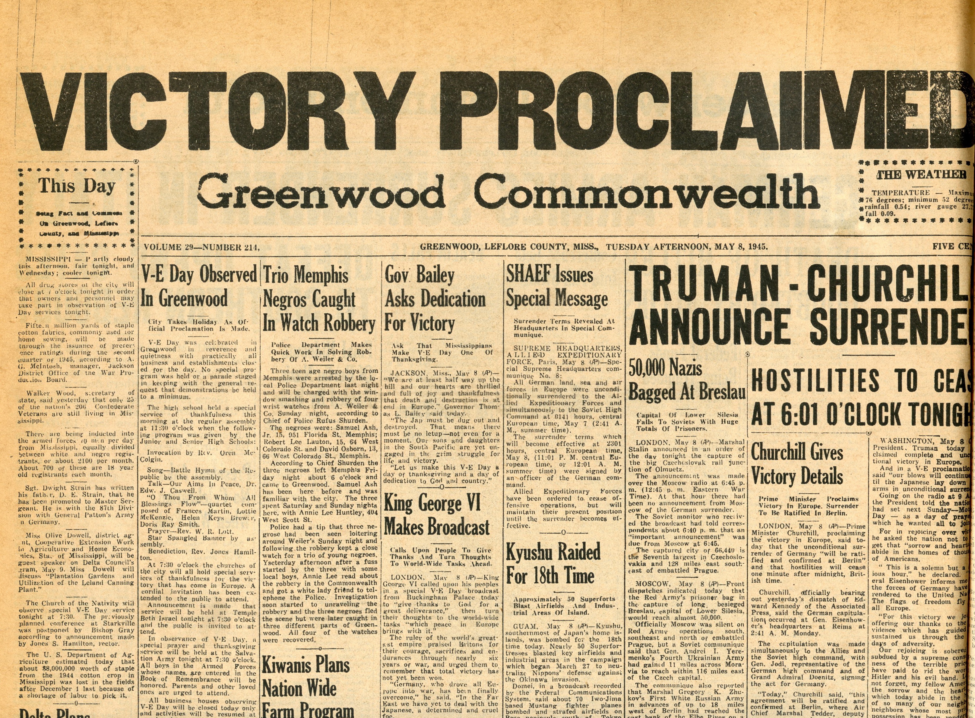 “The war in Europe was winding down and it looked like it would soon be over. On May 8, Victory in Europe was declared and we celebrated V-E Day. Botts [Blackstone], my boss, did not like to give holidays any time except the traditionally observed and did not see any reason for businesses to close or people to take off. The churches were having services that day and many places were closing, and I pouted until he finally told me to go on home.