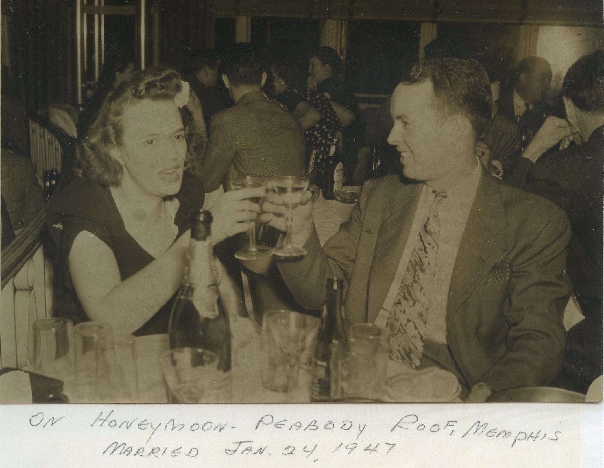 “I was married in a tan gabardine suit from Fountain’s and wore a wide brim brown hat and had a corsage of talisman roses. We went to the Peabody Roof on Saturday night with Leota, my friend from Jackson, and her husband Bill. On Sunday afternoon we left for Oxford so that Russell could be back on the job Monday morning. Our honeymoon was not very glamorous as I followed him around on his sales route Monday and Tuesday before returning to Greenwood.”