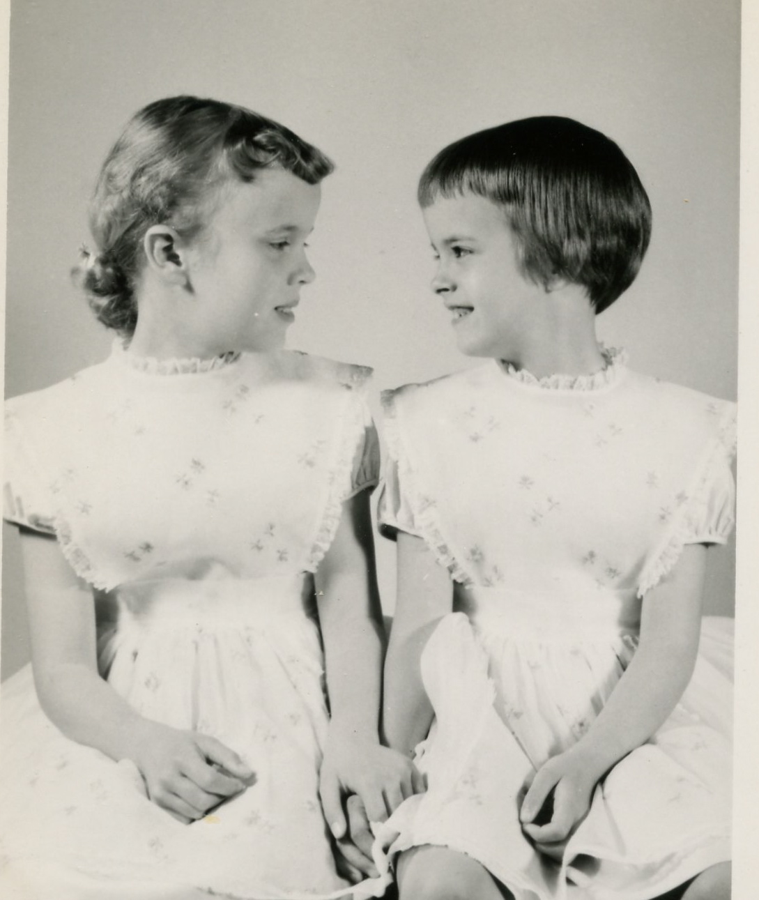 “I took hundreds of snapshots both for the paper and for myself, and then I decided it would be fun to do some portraits, so I bought flood lights, set them up in the living room with a big shade on a wooden frame as a backdrop. Russell and Tricia’s husband, Claude, had put the frame together for me. From that time on Cathy and Mary Carol were asked to pose almost daily. Thus came all the thousands of pictures and portraits we now have in albums and stacked away. Later I bought a Yashicamat camera which took much better pictures and an electronic flash which helped a lot.”