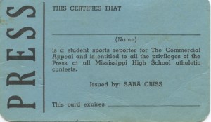 One other story: I met several folks in college who had been Sara’s “student reporters” at their high school. It was a big deal to them, as they carried a press card and had to scoot off to find a pay phone as soon as their team’s game was over. One of these friends has his press card in his wallet to this day and has used it to get in college football games, rock concerts and across police lines at crime scenes. He just flashes the word “Press,” looks important and off he goes. Sara’s kind of guy.