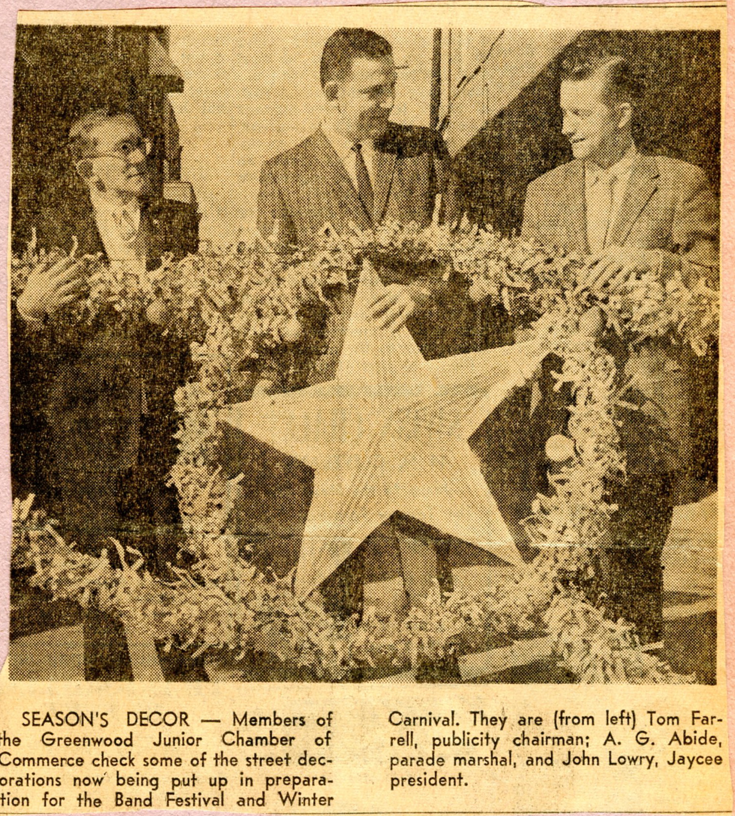 As the skies over Greenwood darkened, it was as if the whole city and thousands of visitors were lined up on every sidewalk and hanging out of every downtown upstairs window, every breath held.  Right at 5 o’clock, not a second before or a second after, the Greenwood Utilities whistle split the night and the Christmas lights seemed to explode in a blaze of color. Back across the tracks on Johnson Street, the Greenwood High School drum major’s baton dropped and sent the Bulldog Band marching off into the first notes of “Jingle Bells,” their cadence setting the pace for 60 or 70 or 100 bands to follow. Float after float after float made that tight turn onto Howard Street, sporting miles of wadded crepe paper and bundled-up Brownies or waving pageant queens or papier mache fireplaces. And the grand finale, the culmination of all this revelry, was the arrival of Santa Claus, on his own float with prancing reindeer, very definitely the real Santa, not one of these imposters that sad towns without Band Festivals had to hire as substitutes.