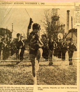 Sara’s second favorite day of the year was the second Friday after Thanksgiving (her favorite? Christmas, of course). Her old buddy, Roy Martin, had enshrined that traditionally rainless December day as the time for Delta Band Festival and Winter Carnival, a beloved Greenwood tradition that celebrated its 75th anniversary last year. During her heyday with the Commercial Appeal, Band Festival had grown into a monster of an event, pulling in what seemed like thousands of yellow school busses from Pass Christian to Iuka. They would be lined up all around the old high school on Cotton Street, discharging spiffily outfitted flutists and tuba players and drummers and majorettes and baton twirlers. Somehow, every year, out of this chaos and confusion, two parades, morning and evening, full of high school students and elaborate floats and that man among men, Santa Claus, lined up and marched and played and heralded the real arrival of the season. And Sara was, as usual, smack in the middle of the action, lining up photos and jotting down names and soaking it all in. Which meant Cathy and I got to soak it all in as well. Schools were out that day and Greenwood kids were the luckiest in Mississippi. It was like a giant house party and we were turned loose for the whole day downtown. The morning parade stepped off from the old high school campus and wound its way south on Howard Street. That was fine, but it was just a dim warmup for the real show, the night parade.