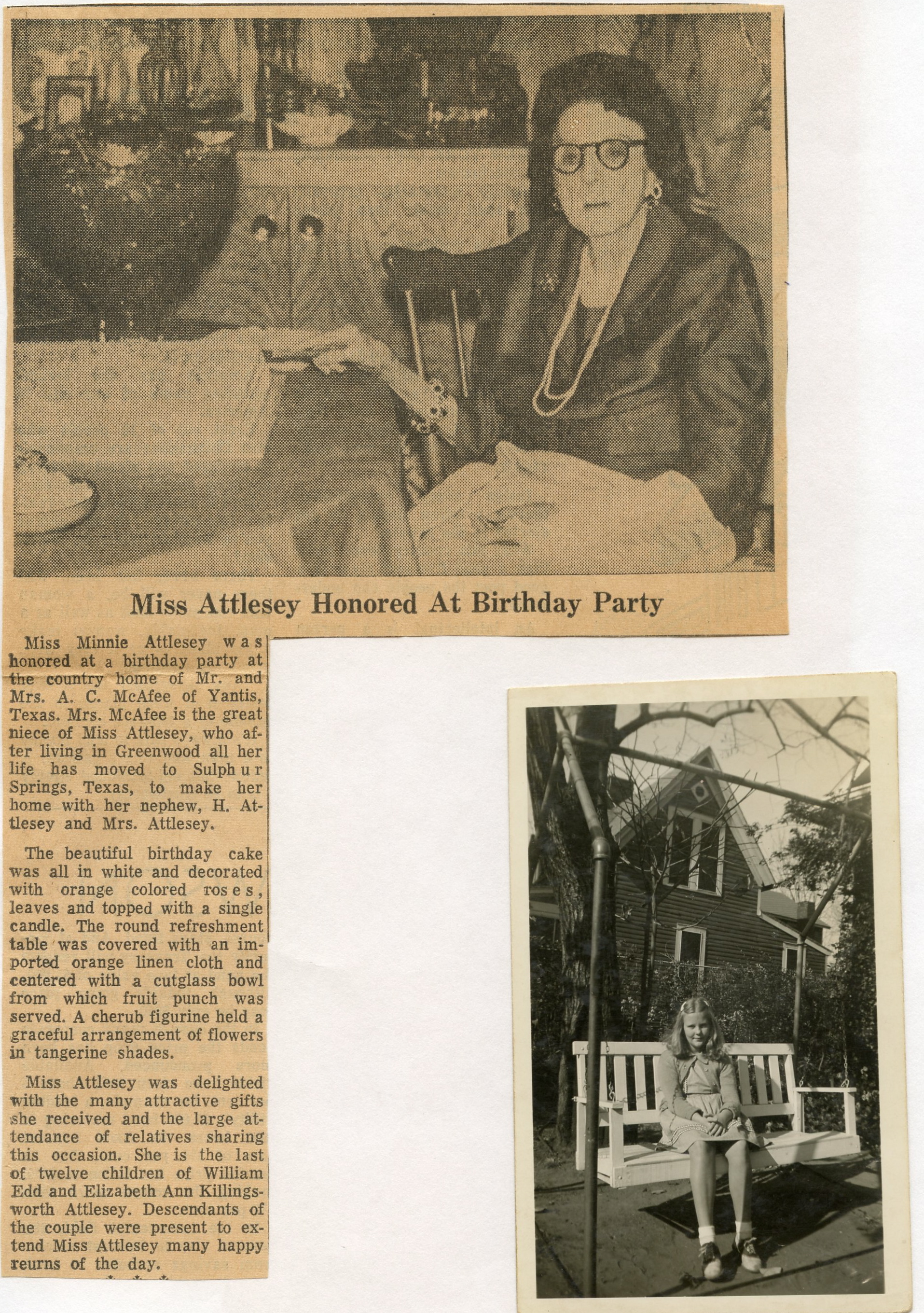 “The Matthews family was one of the older families of Jackson. They were extremely close with their money and owned worlds of property. The four old maids bossed the girls and their mother and told them every move to make. Mama was always sorry for Pina, the mother, because she didn’t have a life of her own. They could not believe all the things we had to play with since the sisters thought it was foolish to buy things like toys. I remember one year Dorothy, who was about nine, was so excited because on her birthday she got a ten cent red patent leather belt and a small box of marshmallows.